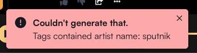 Artist Name in Tags Error: There’s an issue where tags containing an artist’s name, which is also a general word or name, can cause an error. Suno is actively addressing this problem. If this happens, you should change the lyrics or the way you prompt them and try again.