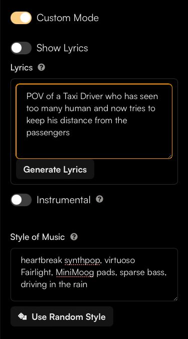 Custom Mode splits the text prompts into 2 panels, a Lyric Generator and a Style of Music prompt. Each has a random generator, and a text box to enter your own.